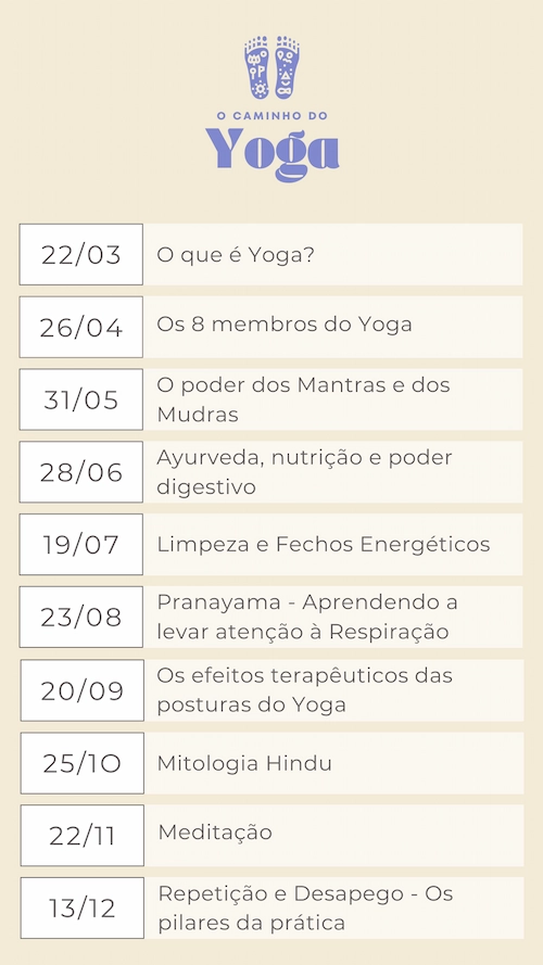 Teremos uma aula por mês ao longo do ano todo sobre um tema relacionado ao Yoga por mês, um total de 10 aulas. As aulas são gravadas e disponibilizadas para os alunos ao longo de todo o curso.